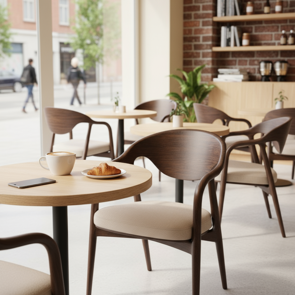 كراسي مطاعم مودرن مصنوعة من خشب طبيعي عالي الجودة، مصممة خصيصاً للاستخدام التجاري في الكافيهات والمطاعم. يجمع هذا الكرسي بين المتانة والراحة، مما يجعله مناسباً للاستخدام اليومي المكثف مع الحفاظ على مظهر أنيق واحترافي.